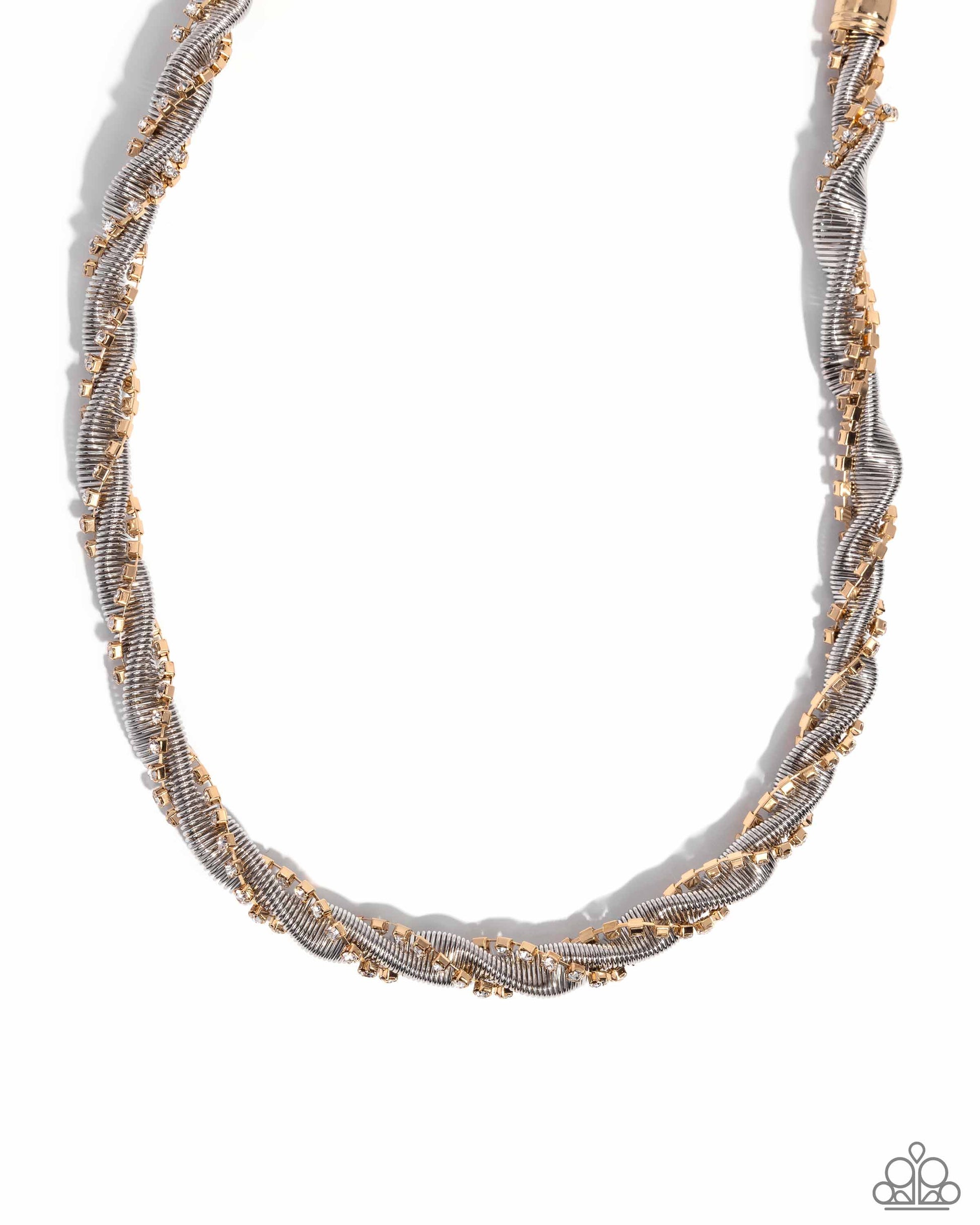 A silver snake chain and a white rhinestone-encrusted dainty gold box chain twists and coils along the neckline, layering into a sassy display of sparkle. Features an adjustable clasp closure.